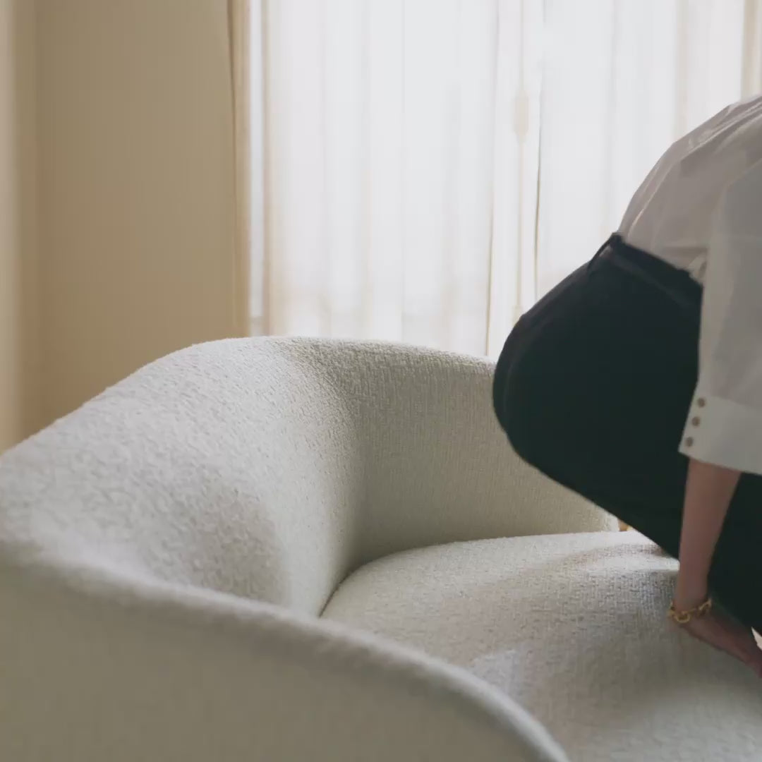 - Poly-acrylic blend boucle upholstery incorporates recycled polyester and is solution-dyed for easier cleaning